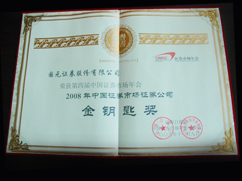 2008年11月9日,第四届中国证券市场年会在北京钓鱼台国宾馆隆重举行。国元证券在此次年会上再获金钥匙奖。