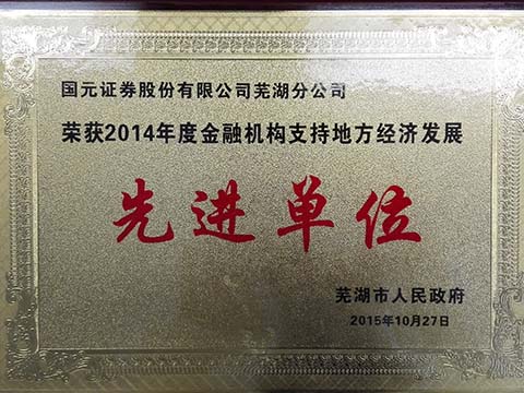 2015年10月27日,芜湖分公司荣获芜湖市人民政府“2014年度金融机构支持地方经济发展先进单位”称号。 该称号是芜湖市人民政府根据全市金融机构在抢抓机遇、开拓创新、为芜湖市经济社会发展提供强有力的金融支持,并取得突出成绩的优秀金融机构而颁发的称号,这是芜湖市政府对国元证券芜湖分公司在金融创新及支持地方经济建设工作的充分肯定和认可。