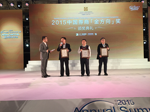 2015年12月11日,“2015中国券商领袖峰会暨2015中国券商「金方向」评选”颁奖典礼在深圳隆重举行。此次评选中,公司荣获“2015中国最佳投资银行”,蔡咏董事长被评为“2015中国最佳创新券商董事长”。公司副总裁陈新受蔡咏董事长的委托参加颁奖典礼,并代表蔡咏董事长发表题为“一带一路,券商出海好时机”的主题演讲。