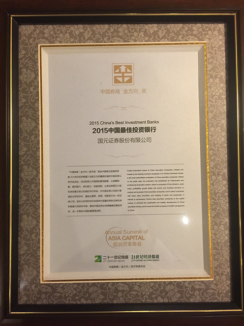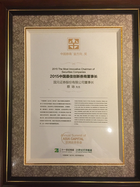 2015年公司立足服务实体经济,坚持创新发展,坚守风控合规,不仅有效防范了年中市场系统性风险,还取得了历史最好经营业绩。公司荣获“2015中国最佳投资银行”、蔡咏董事长荣获“2015中国最佳创新券商董事长”,这也是对公司2015年经营管理尤其是服务实体经济、风险管控以及创新发展的充分认可。