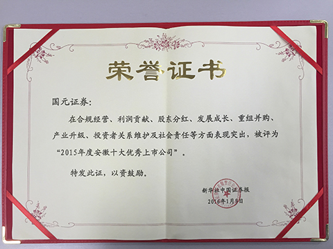 2015年,资本市场大起大落,对券商而言更是多事之秋,27家AA级证券公司中,超过一半因违法违规行为遭受监管部门的处罚。公司坚持稳健经营,坚守风控合规,不仅成功抵御了突发的市场系统性风险,还取得了历史最佳经营业绩,是少数未被处罚的AA级券商。优异的市场表现也为公司带来了一系列的社会荣誉:荣获2015中国最受投资者尊重的百家上市公司前十佳、连续八年获得深交所信息披露A类评级、支持地方经济发展绩效考核一等奖、2015年度风险管理金蝉奖、2015年最佳投资银行等十多个奖项。公司荣获“2015年度安徽十大优秀上市公司”可谓实至名归。