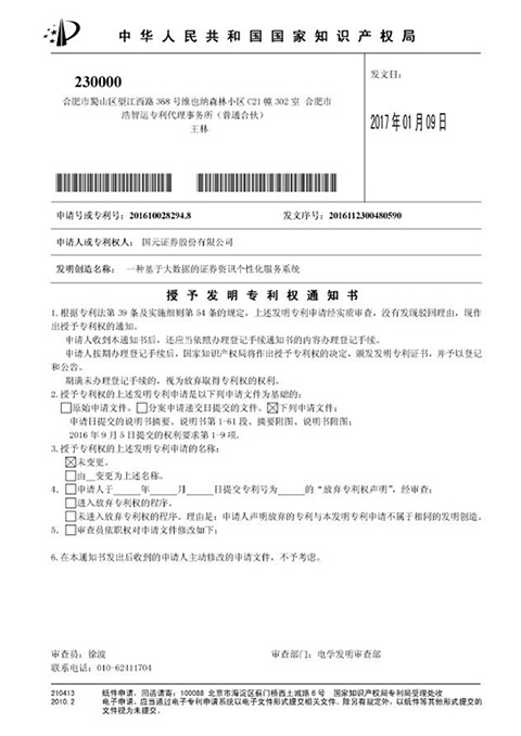 近日,公司收到国家知识产权局的《授予发明专利权通知书》,公司申报的《一种基于大数据的证券个性化服务系统》获得国家发明专利授权,专利号为201610028294.8。
