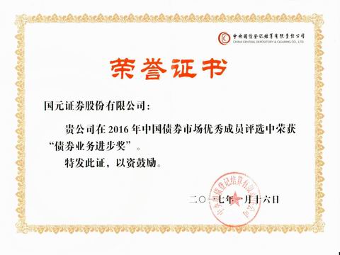 2017年1月16日,由中央国债登记结算有限责任公司主办的“中国债券市场优秀成员评选”获奖名单在北京揭晓,公司荣获“债券业务进步奖”奖项。
