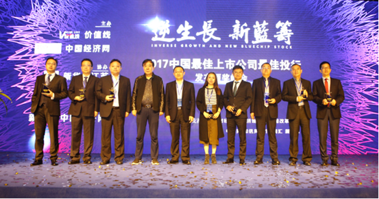 由中国经济网、《价值线》杂志等单位主办的“2017(第四届)中国最佳上市公司暨最佳投行颁奖峰会”在美丽的苏州阳澄湖举办,来自全国的最佳上市公司、最佳投行、细分行业冠军公司领导、金牌董秘和部分地方金融办官员约200名翘楚精英汇聚一堂,共同分享、见证资本市场创造者和创新者的理想和情怀,并围绕未来五年的经济趋势和投资策略等价值话题展开积极讨论,新华网、中国经济网现场直播颁奖典礼。公司副总裁沈和付、投资银行总部副总经理胡伟受邀出席此次盛会。此次颁奖峰会上,公司喜获“2017最佳成长投行”荣誉,胡伟先生荣获“2017最佳投资银行家”称号。