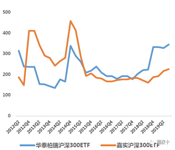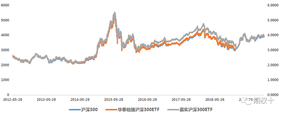 提起300ETF期权,很多投资者朋友可能会联想到中金所的沪深300股指期权。在小编看来,它们之间的关系可以用“藕断丝连”来形容。说“藕断”是因为这两者的标的物不一样(300ETF期权的标的物是300ETF,沪深300股指期权的标的物则是沪深300指数),上市交易所不一样,在合约要素和交易规则方面也存在不同。但由于300ETF本身又是追踪沪深300指数的被动指数型基金,因此可以说是“师出同门”,但又“藕断丝连”。下面我们将从基本面角度出发,对比分析300ETF和50ETF之间的区别和联系。即将上市的300ETF期权有两种,第一种的标的是华泰柏瑞沪深300ETF(代码:510300),属于上海证券交易所;第二种的标的则是嘉实沪深300ETF(代码:159919),属于深圳证券交易所。和50ETF(代码:510050)一样,两只300ETF的投资风格都属于大盘价值风格型基金。同时,作为跟随沪深300的被动型指数基金,它们的比较基准均为沪深300指数(代码:000300.SH)。从图1可以看出,自2012年基金成立以来,这两只300ETF与沪深300走势基本相同。截止2019年三季度,华泰柏瑞沪深300ETF和嘉实沪深300ETF的基金规模分别达345.12亿和226.49亿元,同期华夏上证50ETF的基金规模为416.62亿元。