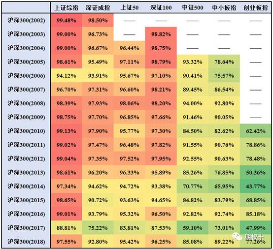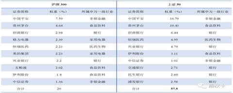 从指数走势上不难看出,沪深300和上证50的运行趋势基本相同,这主要是源于两者极为相似的权重股成分和行业构成:1、从成分股角度来看,上证50的成分股全部隶属于沪深300,即上证50是沪深300的一个子集,并且上证50成分股在沪深300成分股的市值权重达50.6%。2、从行业分布来看,上证50和沪深300的金融特性都非常明显,以银行和非银金融为代表的金融股权重分别为56.7%和34.1%。因此在各大指数中,沪深300与上证50日对数收益率的相关性较高,而和中小指数(如中证500、中小板指、创业板指)相关性相对较差。