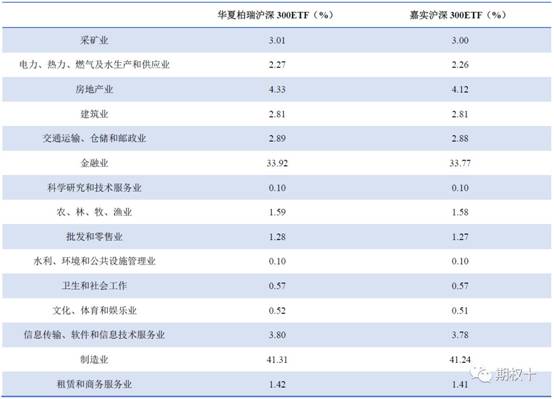 表5:华泰柏瑞沪深300ETF和嘉实沪深300ETF行业配置对比