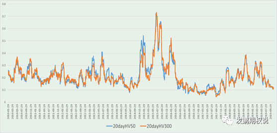 c.同样基于300与50之间的强相关性,且该相关性进一步联系到两者历史上实际波动率差异存在明显的均值回复特性,延展开来会使得300期权上市后的隐波与50期权的隐波差符合稳定区间的规律,匹配合理的行情背景与预期后,存在做空高隐波做多低隐波的品种间隐波套利策略机会(下图为10年以来50全收益指数vs300全收益指数20日历史波动率对比图,可以发现50在历史上的价格波动性较300要稍高,但总体走势几乎一样);