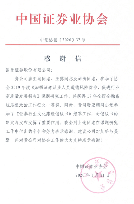 日前,中国证券业协会发来对公司的感谢信,感谢公司对协会文化建设和道德风险防范工作的积极贡献和大力支持。感谢信指出,公司唐亚湖、王露、刘涛等同志积极参加了协会2019年度《加强证券从业人员道德风险防控,促进行业高质量发展报告》课题研究工作,并获得2019年全国金融系统思想政治工作征文一等奖,给协会和公司赢得了荣誉。同时,唐亚湖还参加了《证券行业文化建设倡议书》的起草工作,对倡议书的制定和发布发挥了重要作用。