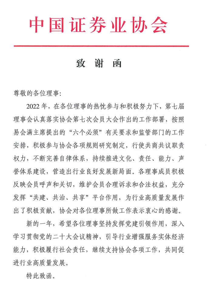 1月12日,公司收到中国证券业协会第七届理事会的致谢函。2022年,公司积极反映会员呼声和关切,维护会员合理诉求和合法权益,充分发挥“共建、共治、共享”平台作用,为行业高质量发展作出了积极贡献。