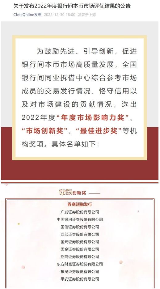 2022年12月30日,中国外汇交易中心暨全国银行间同业拆借中心公布了2022年度银行间本币市场评优结果机构奖项,国元证券因短期融资券发行工作表现出色获得市场创新奖,共有10家券商获得该项奖项。