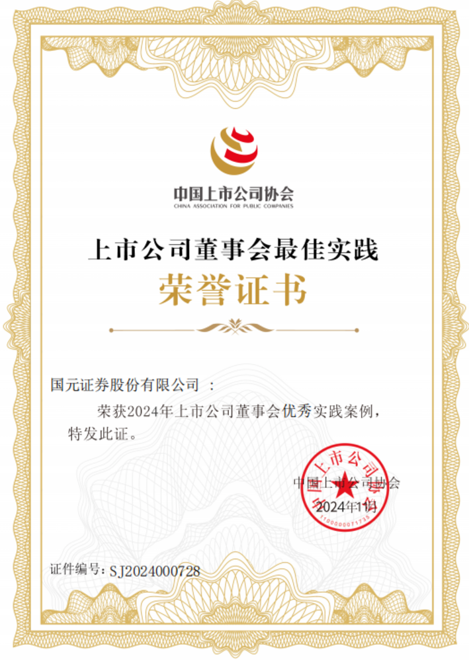 近日,中国上市公司协会公布了2024年“上市公司董事会最佳实践案例”评选结果,国元证券再次荣膺“上市公司董事会优秀实践案例”,连续两年获此殊荣。
